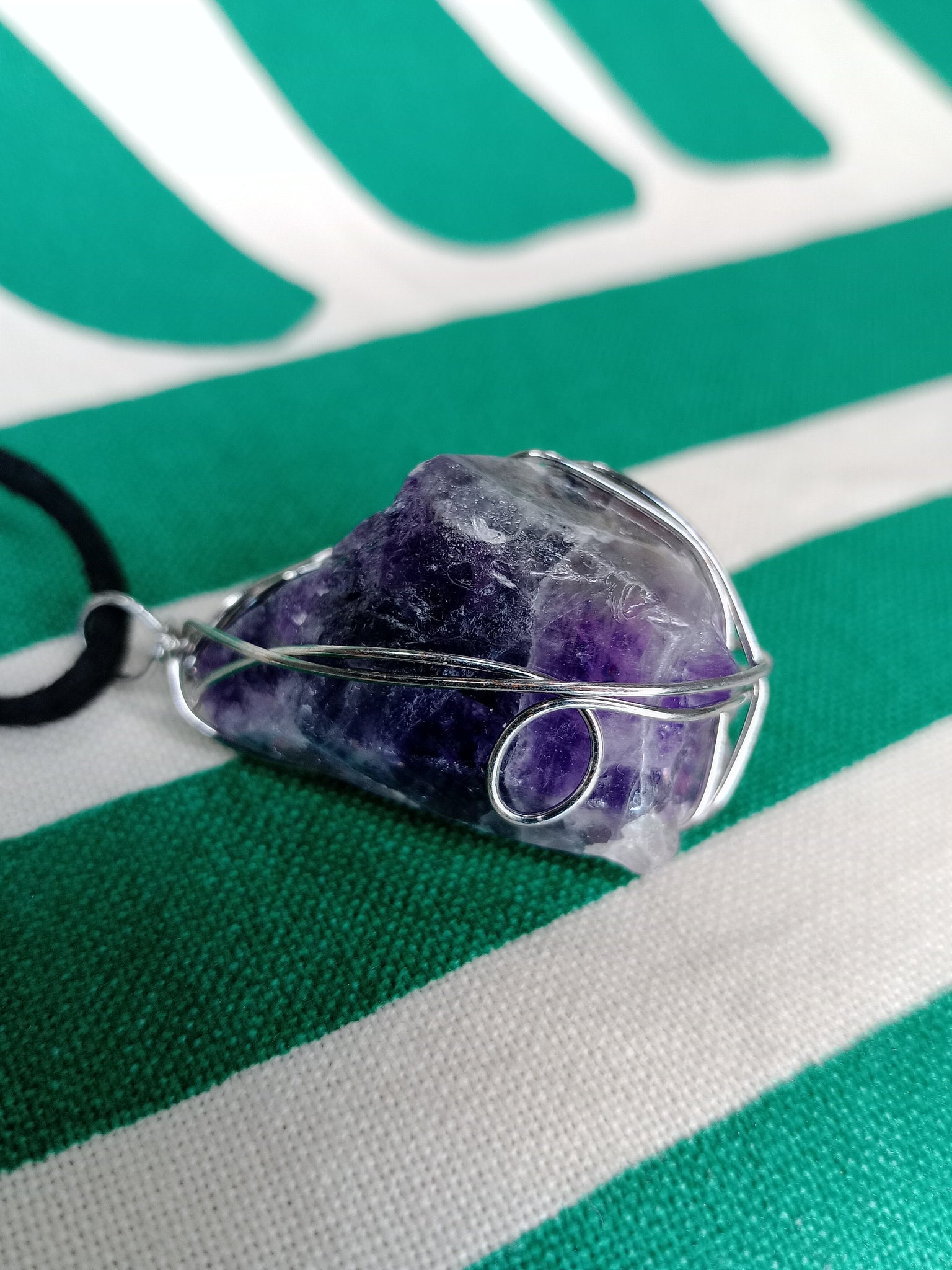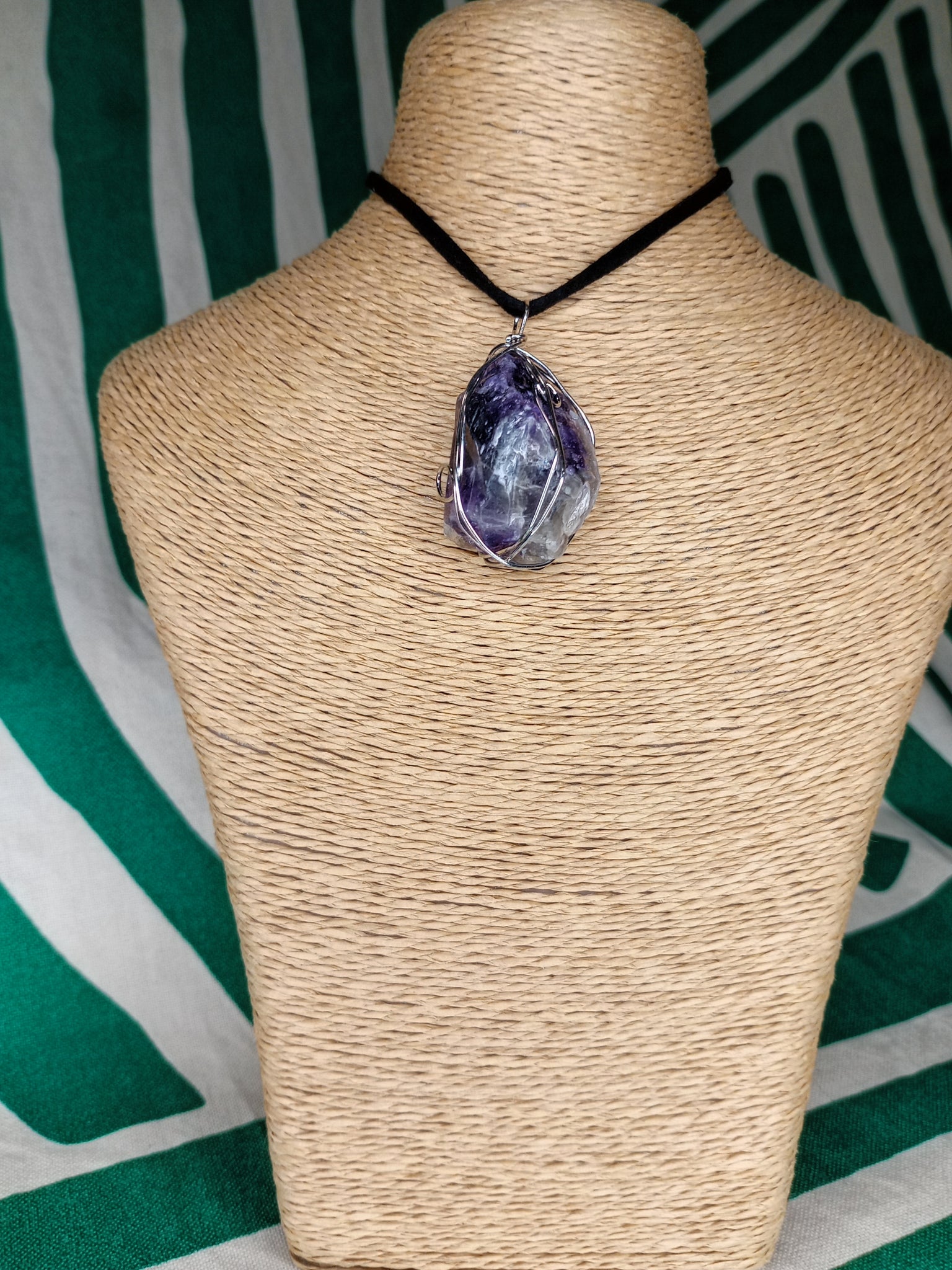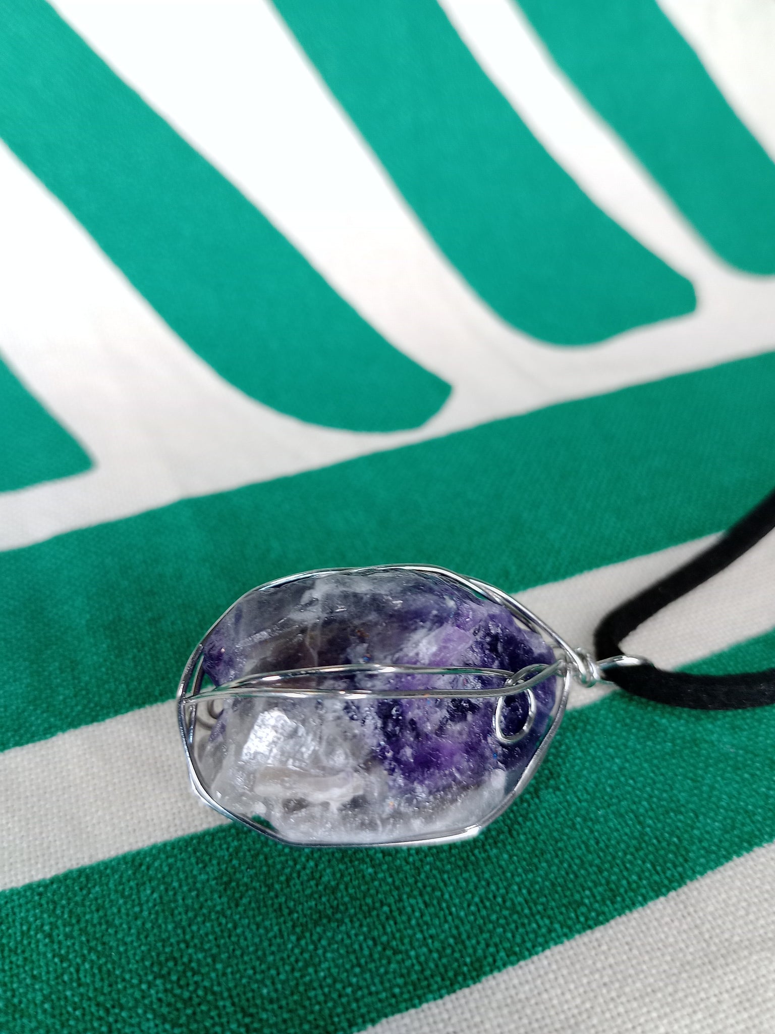 Material: Mineral natural Medida: 4 x 2.5 cm aprox. Incluye cordón negro.