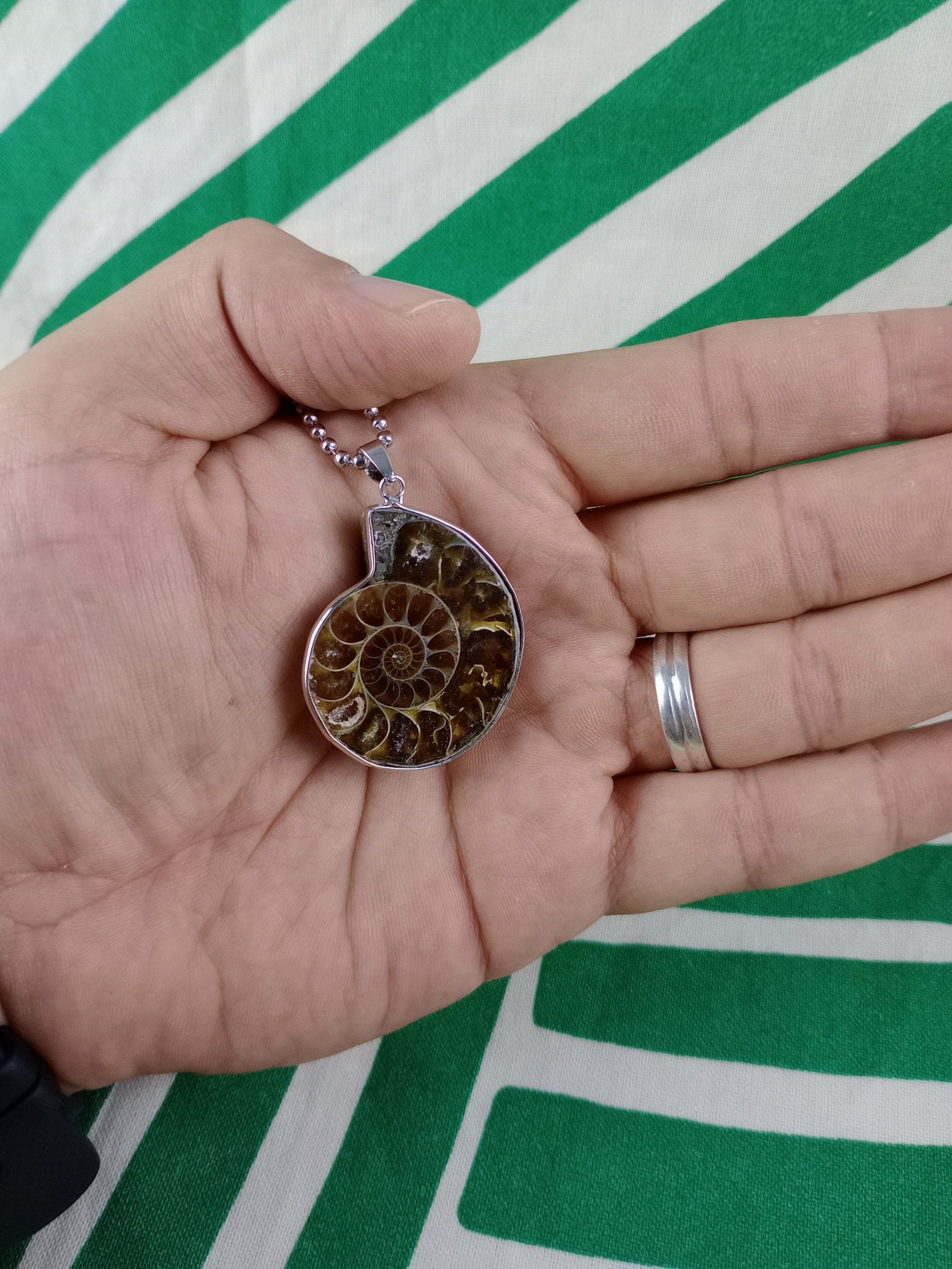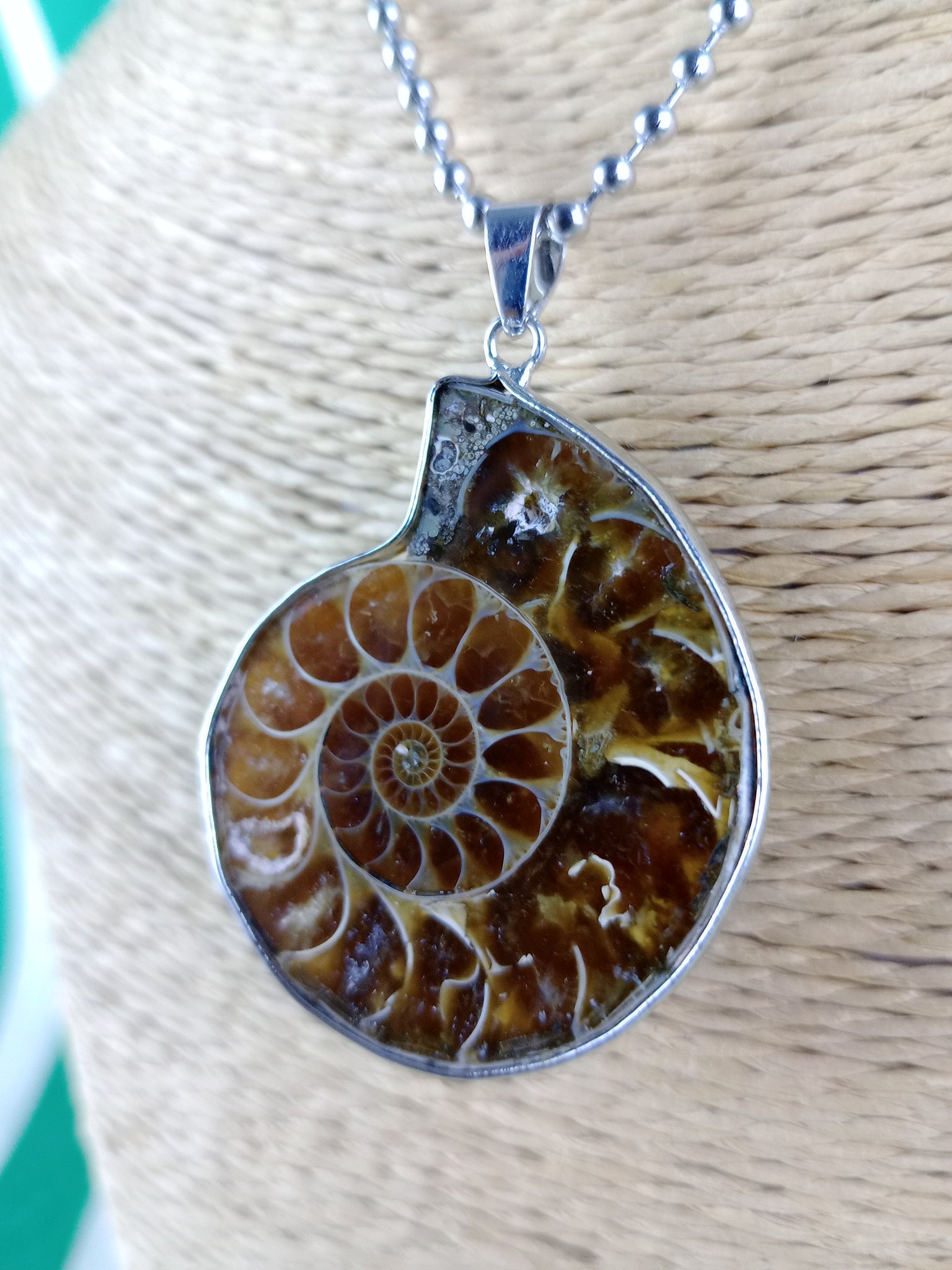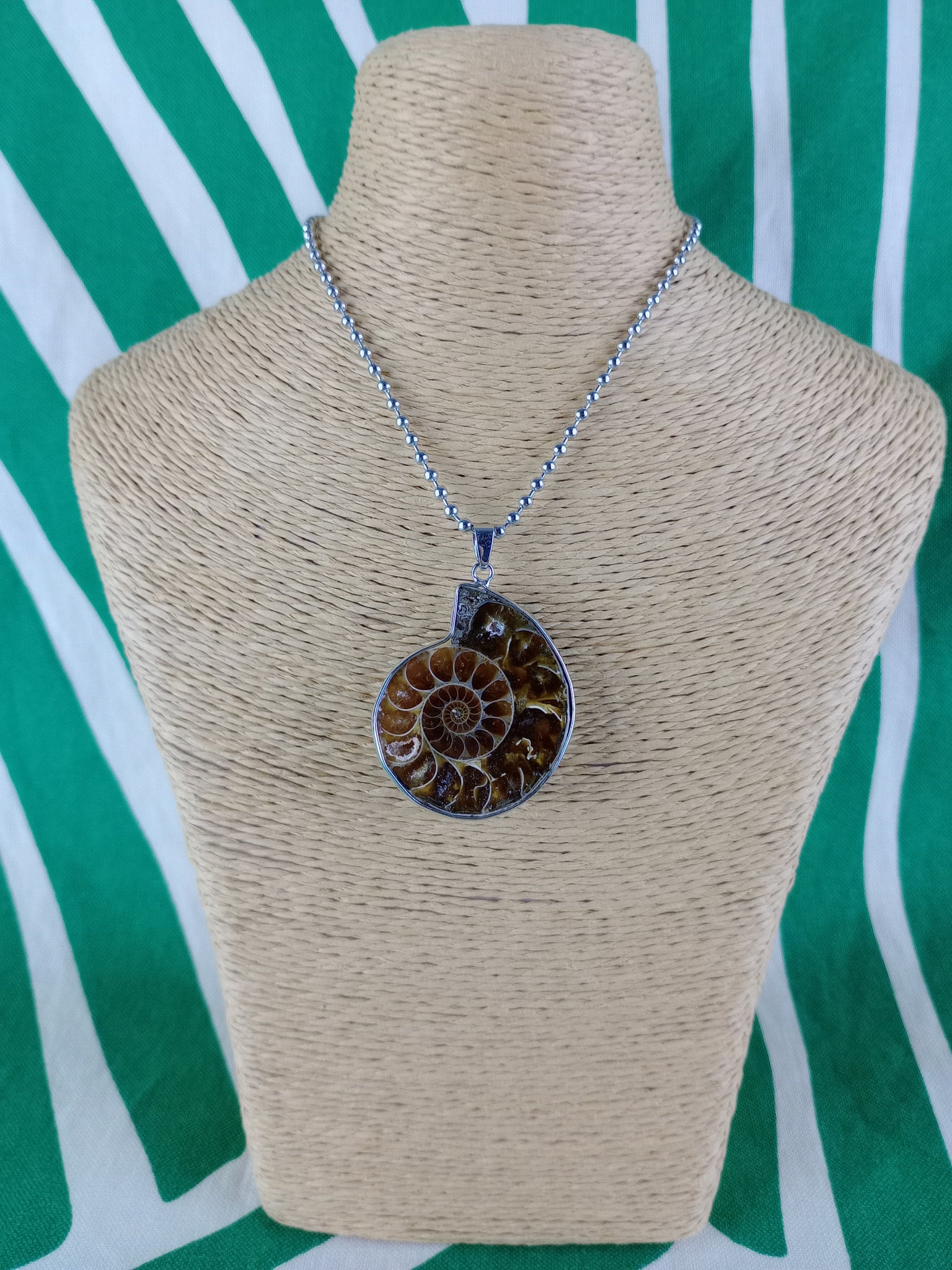 Material: Mineral natural (fósil)Medida: 3 x 3.5 cm. Medida aproximada. Incluye cadena acero inoxidable.