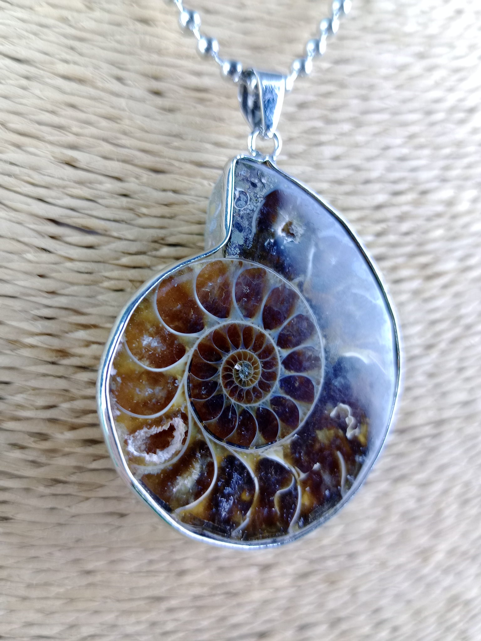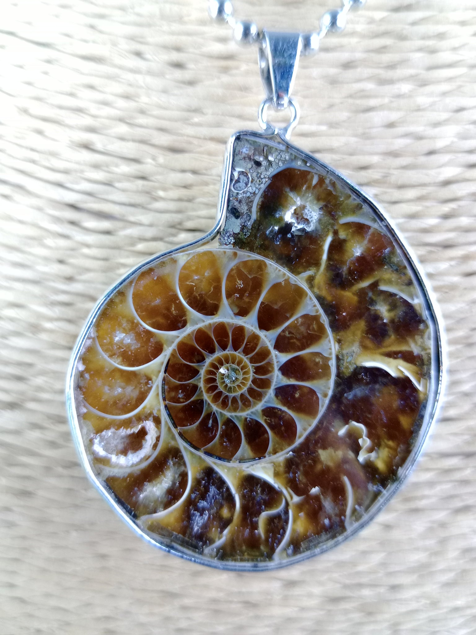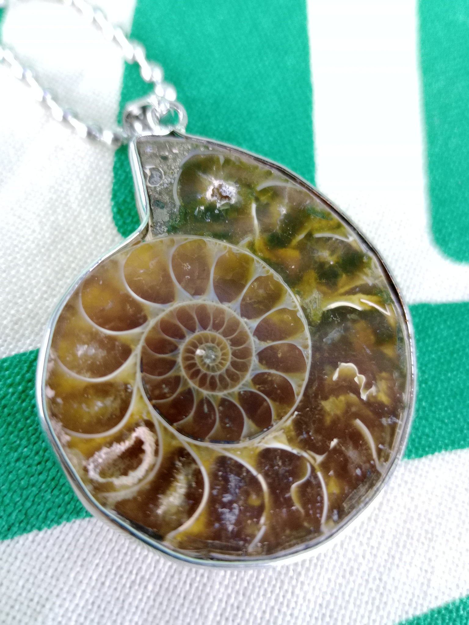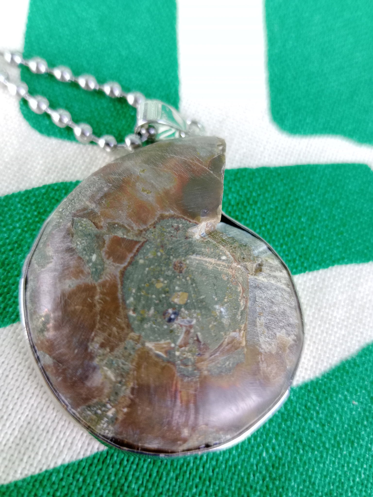 Material: Mineral natural (fósil)Medida: 3 x 3.5 cm. Medida aproximada. Incluye cadena acero inoxidable.