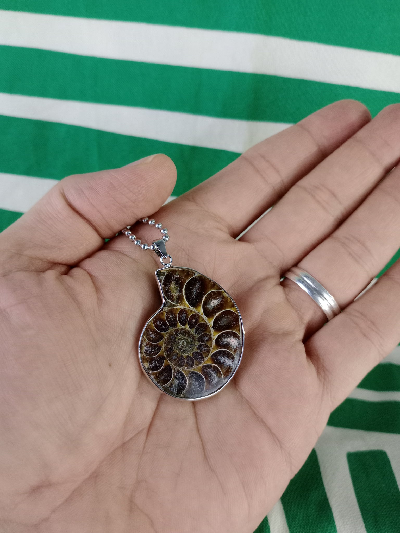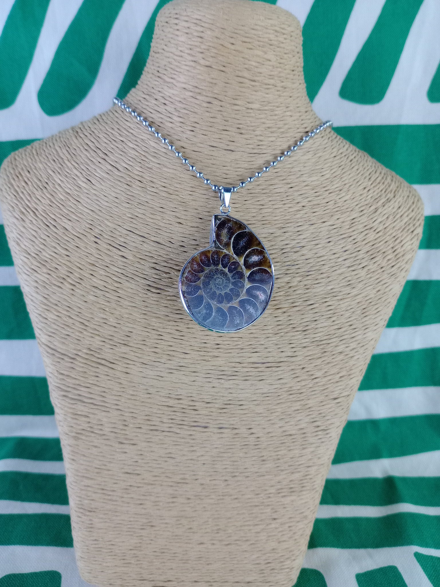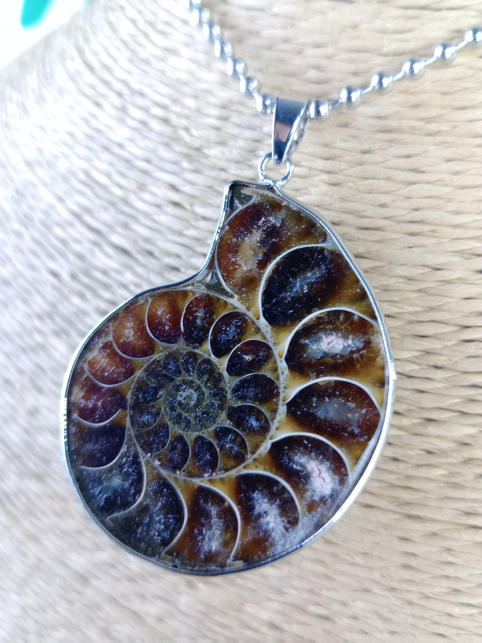 Material: Mineral natural (fósil)Medida: 3 x 3.5 cm. Medida aproximada. Incluye cadena acero inoxidable.