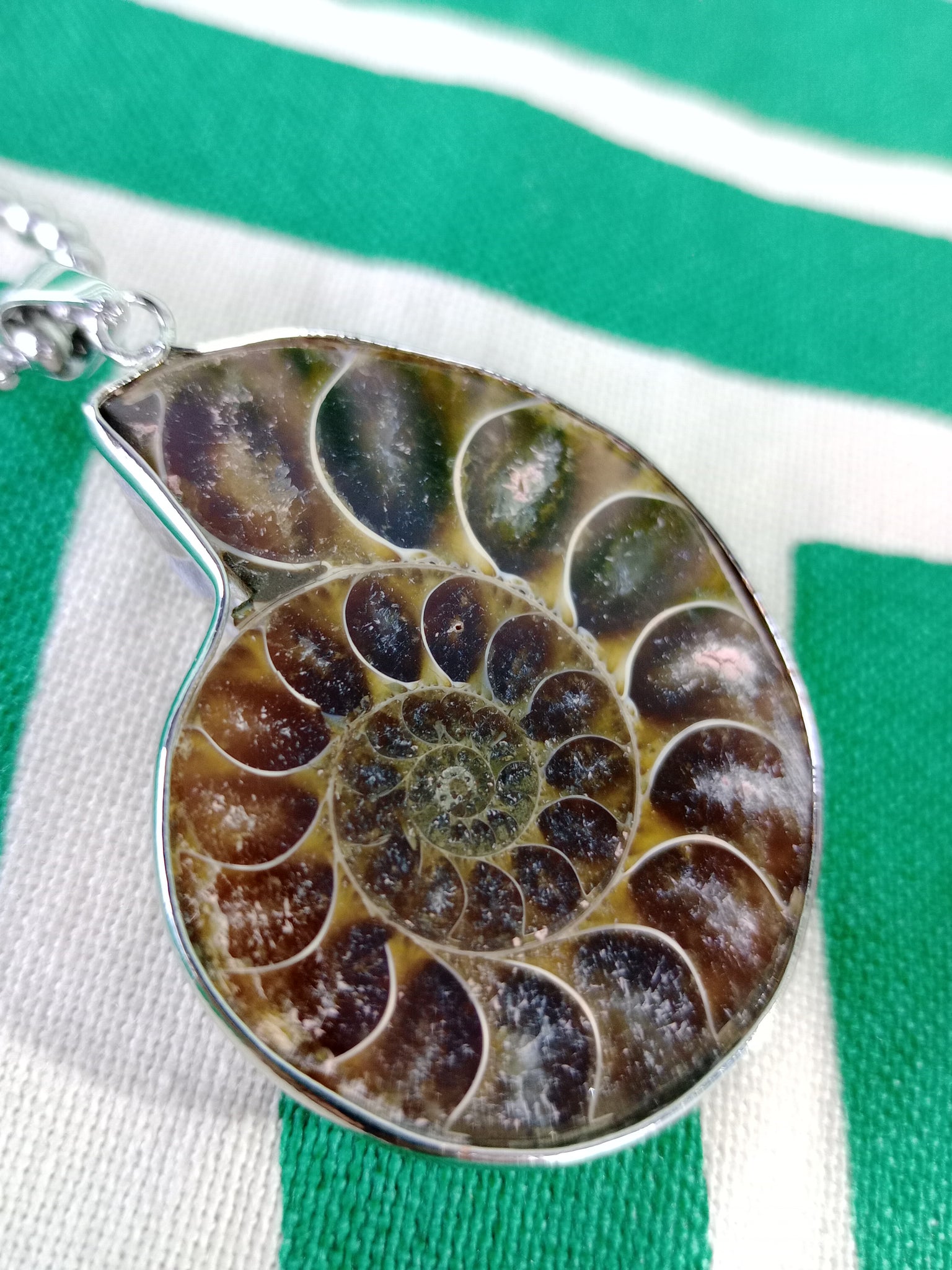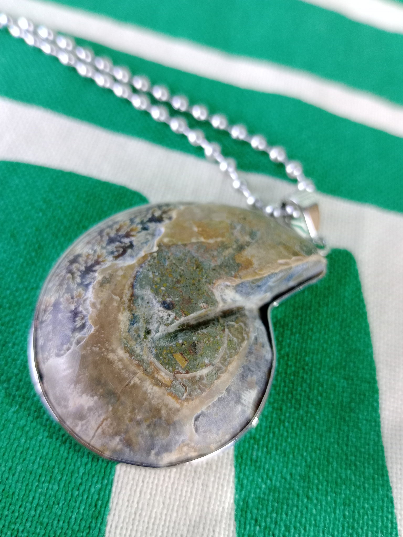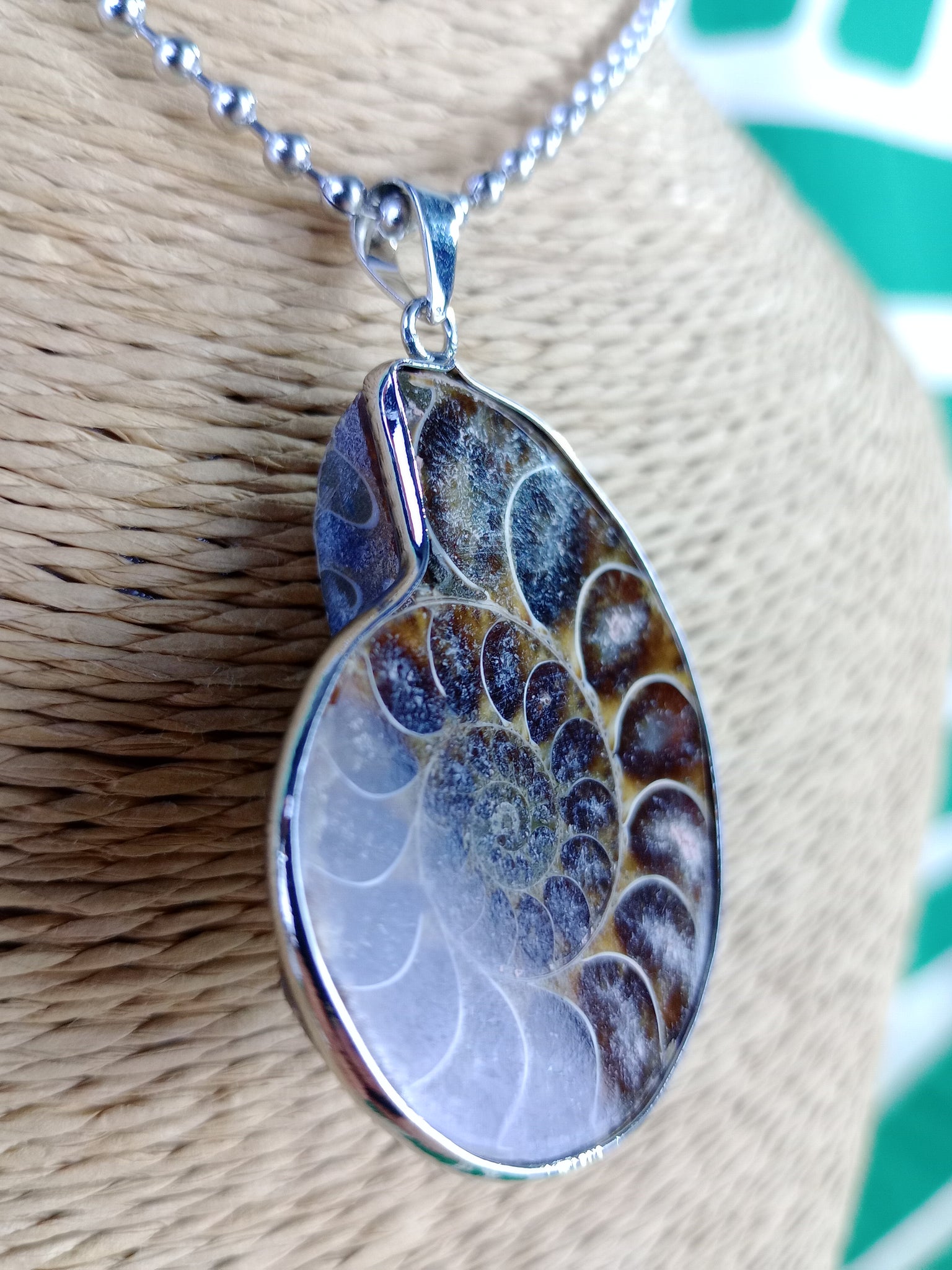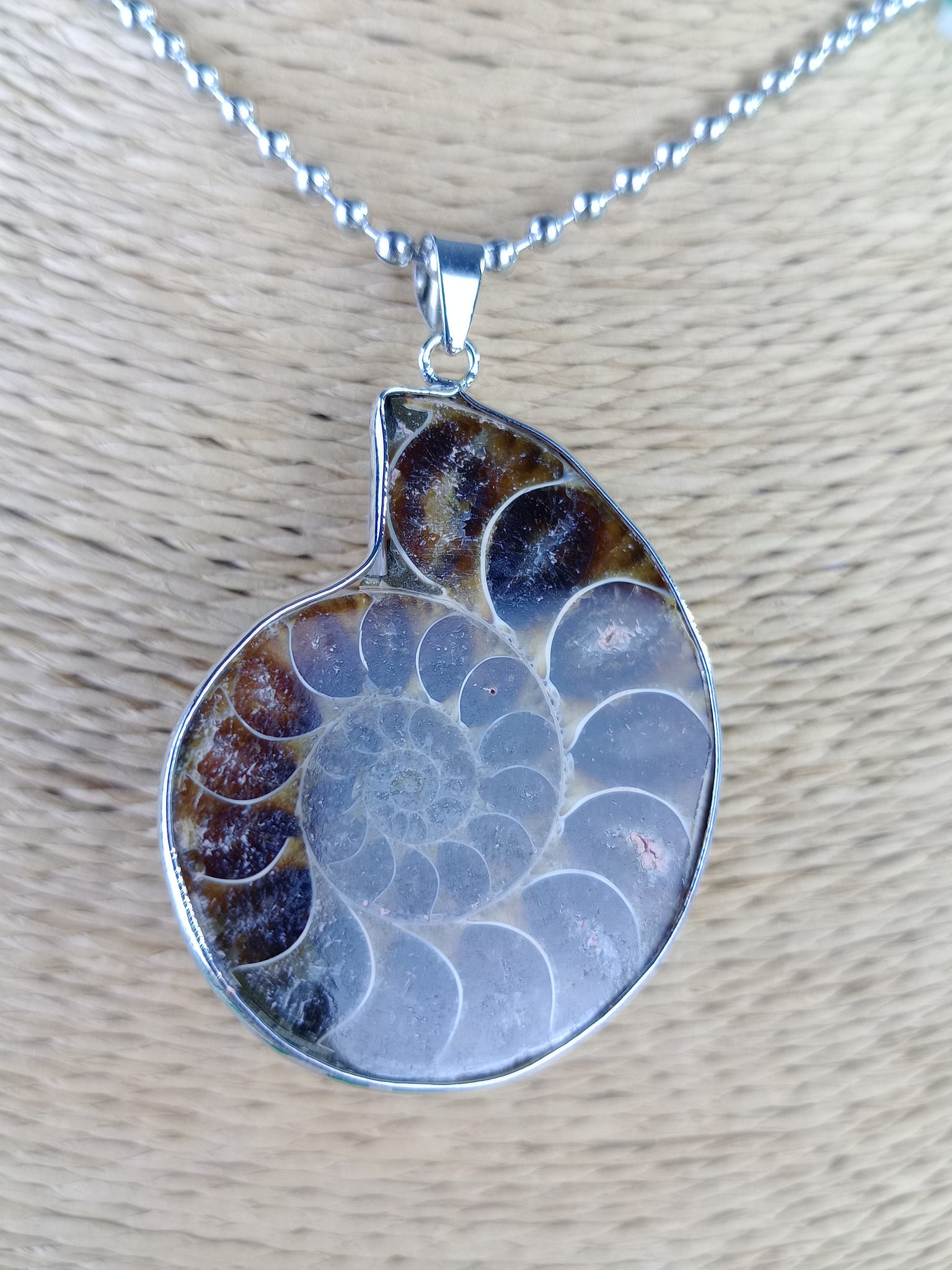 Material: Mineral natural (fósil)Medida: 3 x 3.5 cm. Medida aproximada. Incluye cadena acero inoxidable.