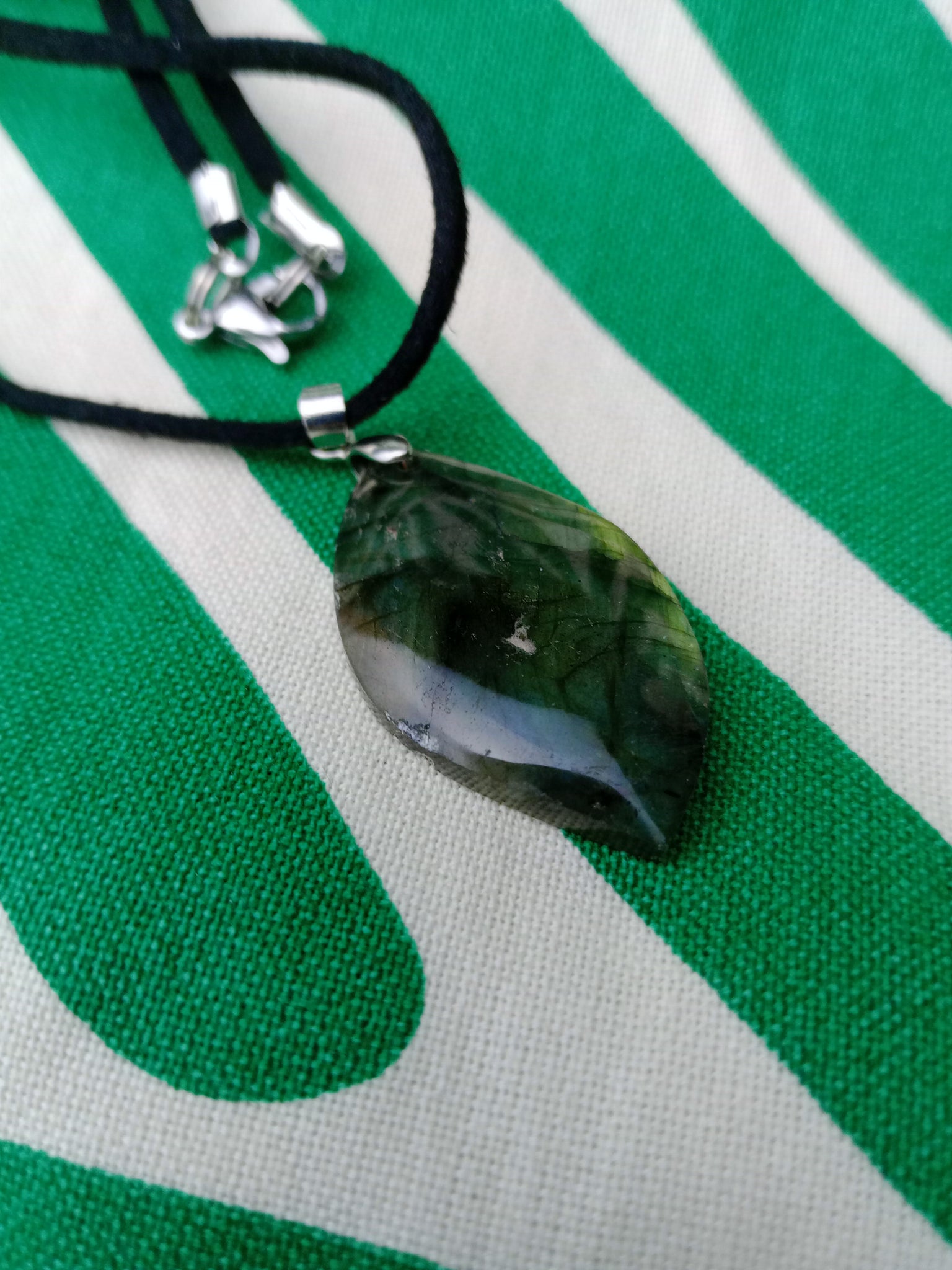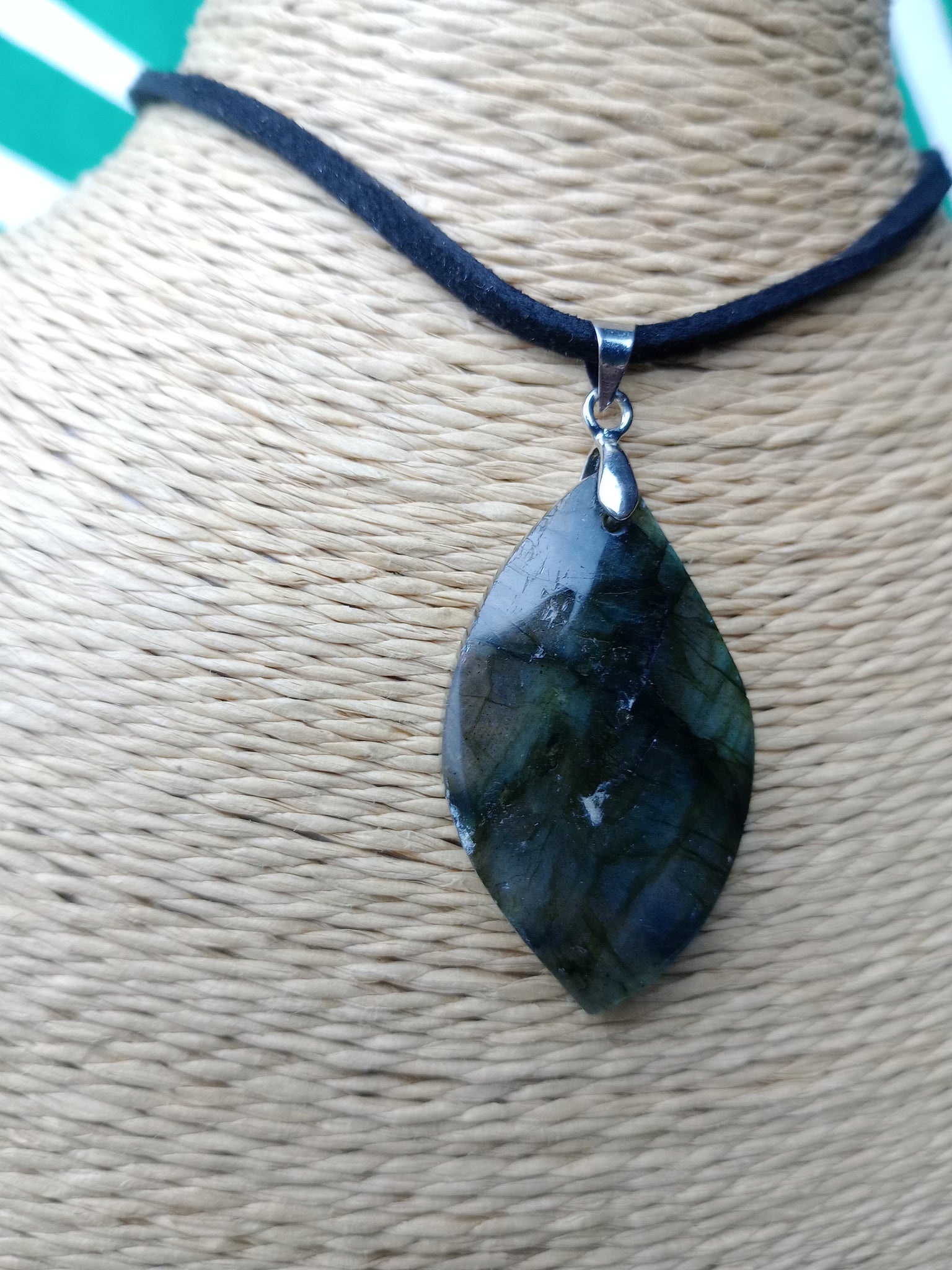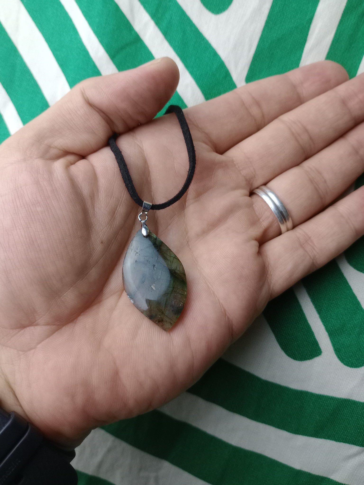 Material: Mineral natural Medida: 3.5 x 2 cm. Incluye cordón negro.