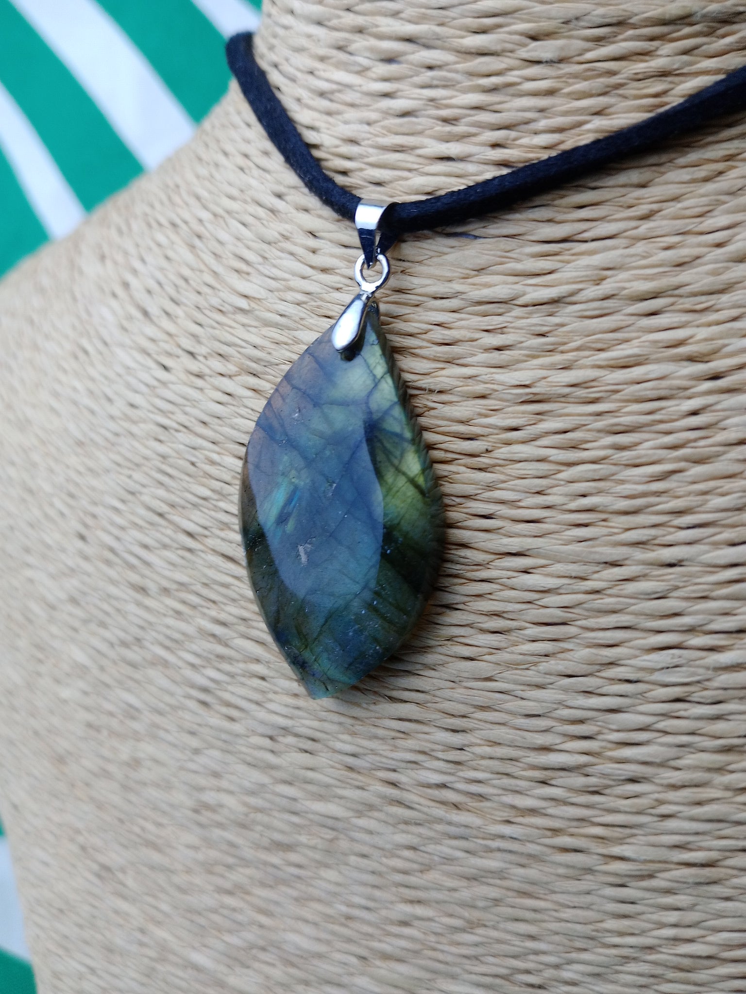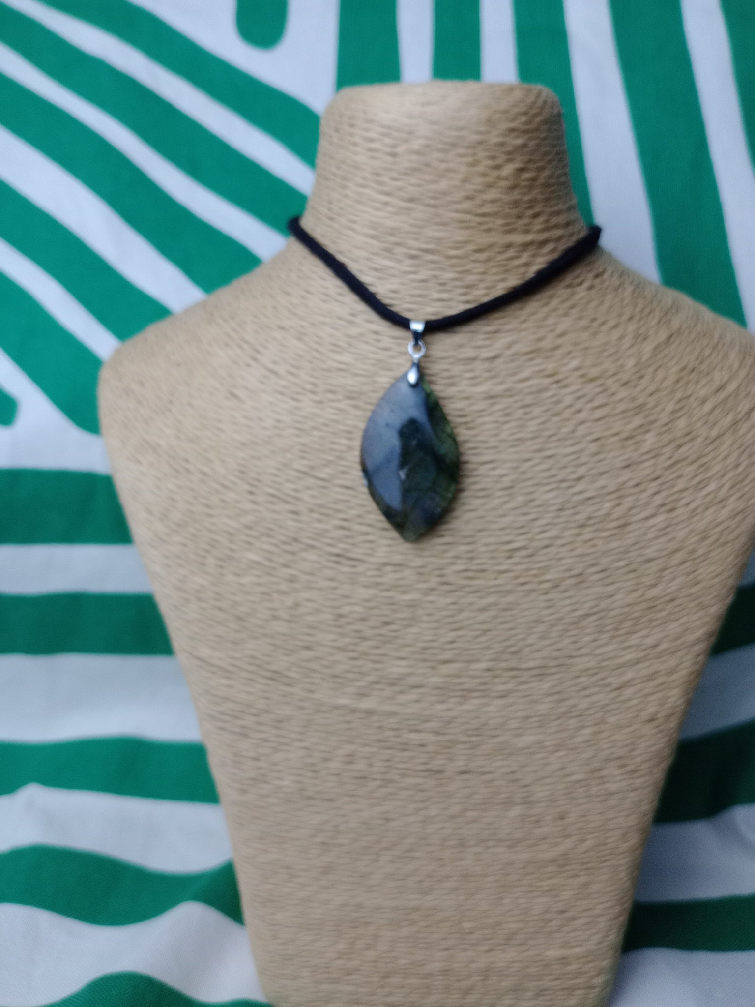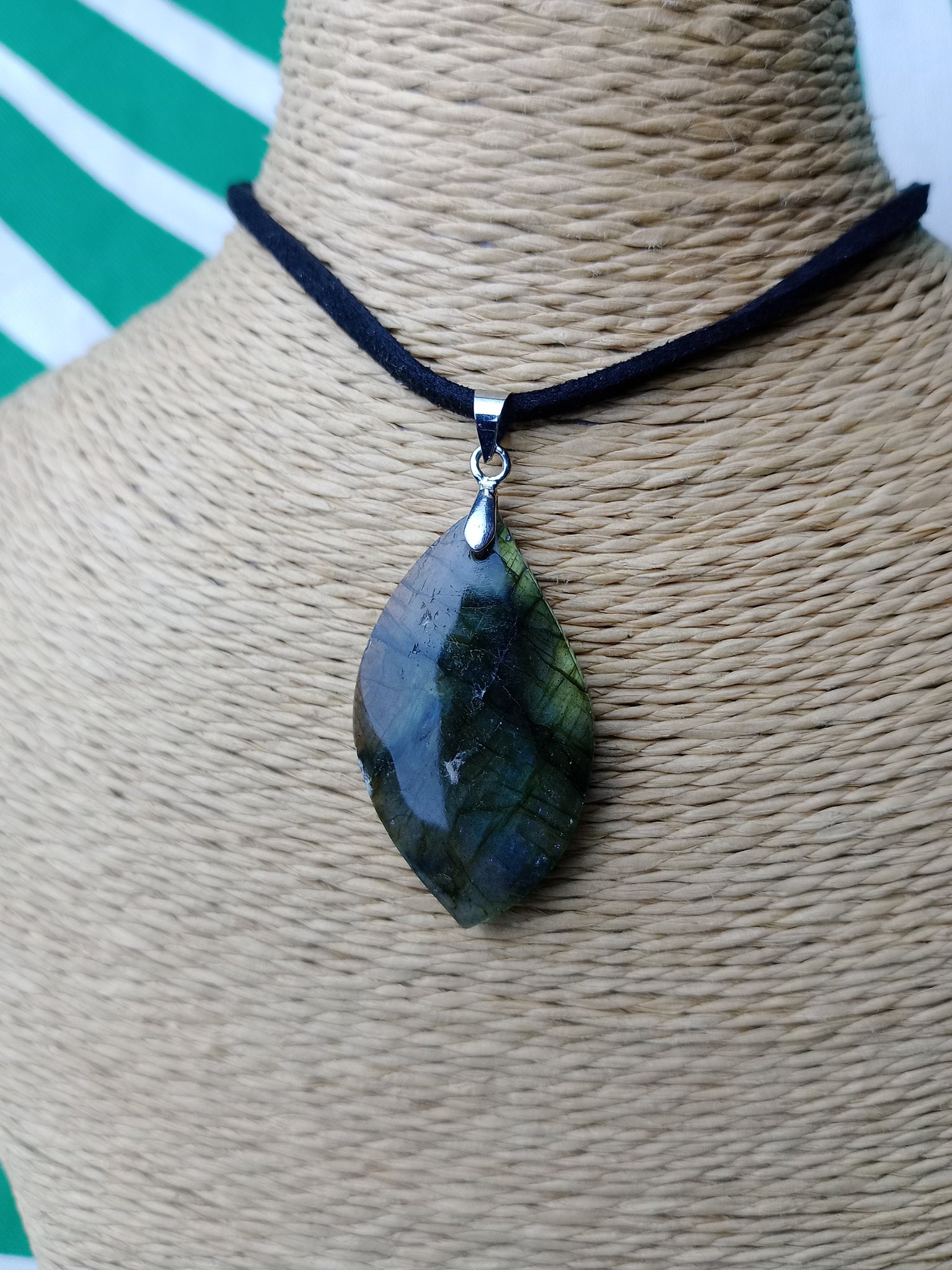 Material: Mineral natural Medida: 3.5 x 2 cm. Incluye cordón negro.