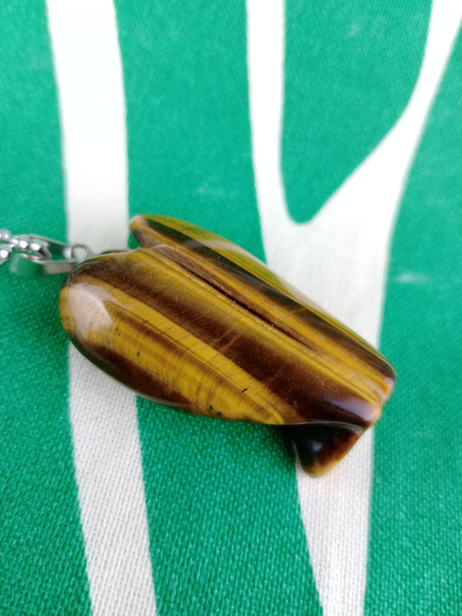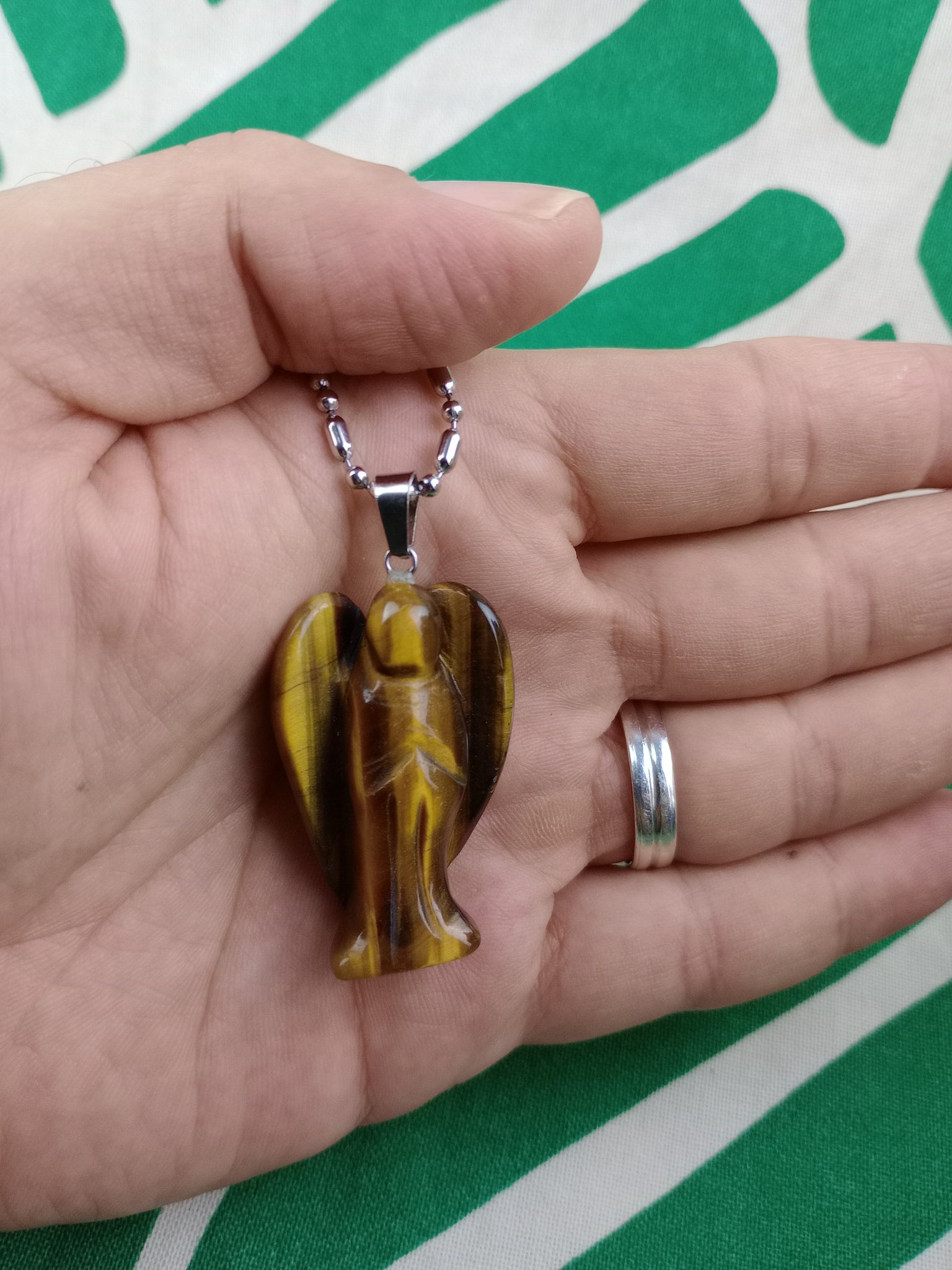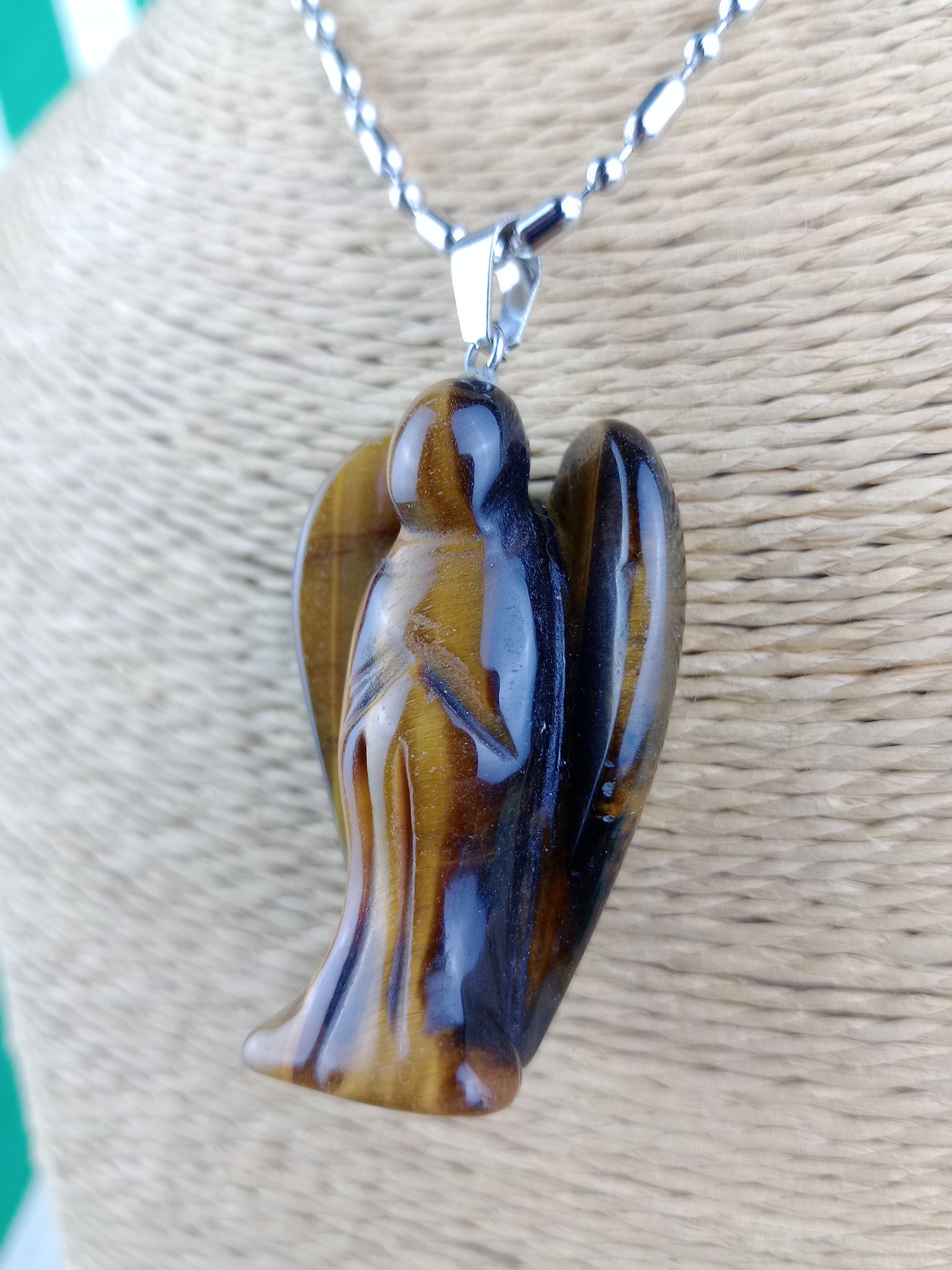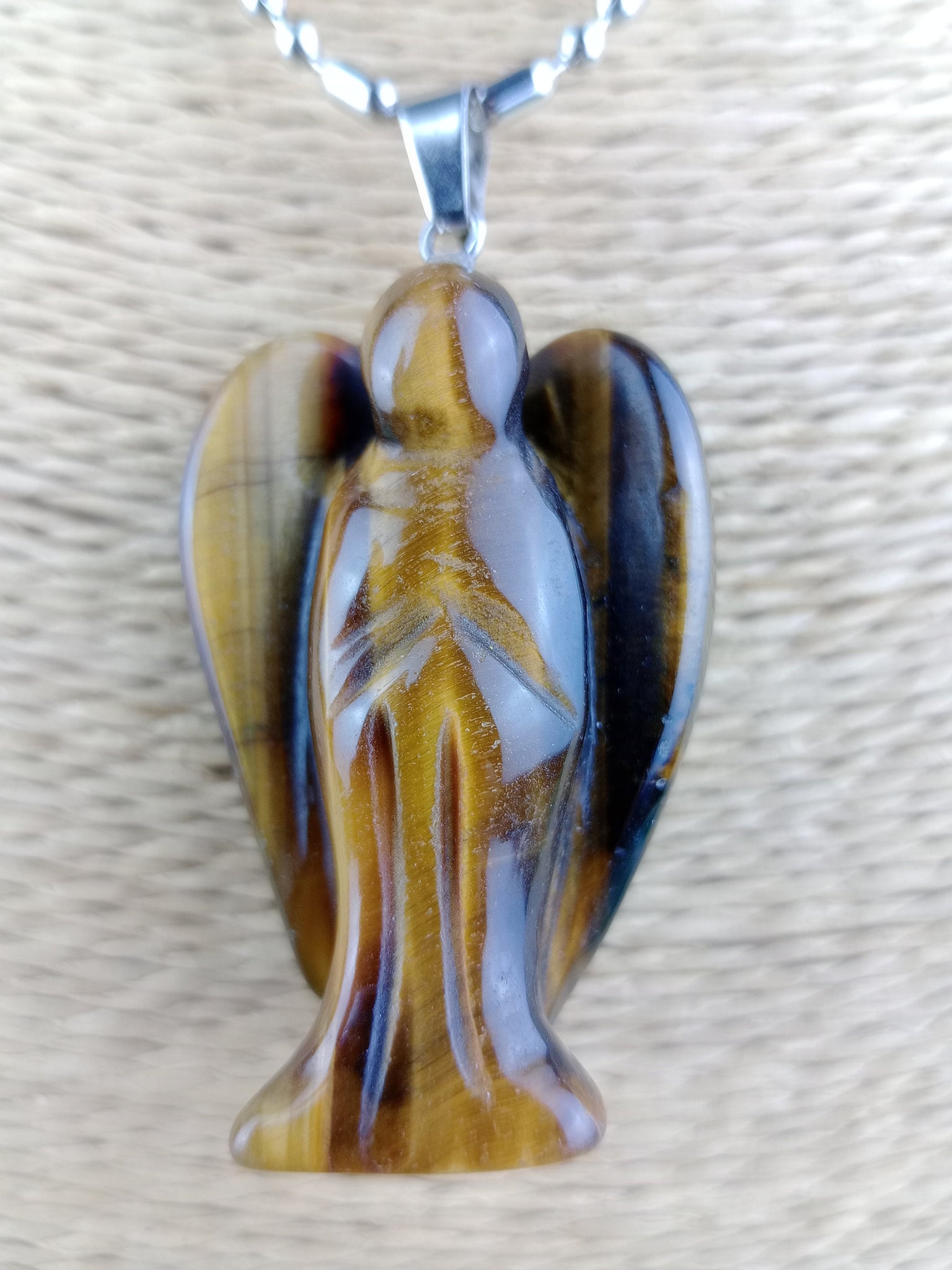Colgante con forma de Ángel guardián, de ojo de tigre, mineral de protección contra el mal de ojo y las energías negativas. Aporta seguridad en uno mismo.
