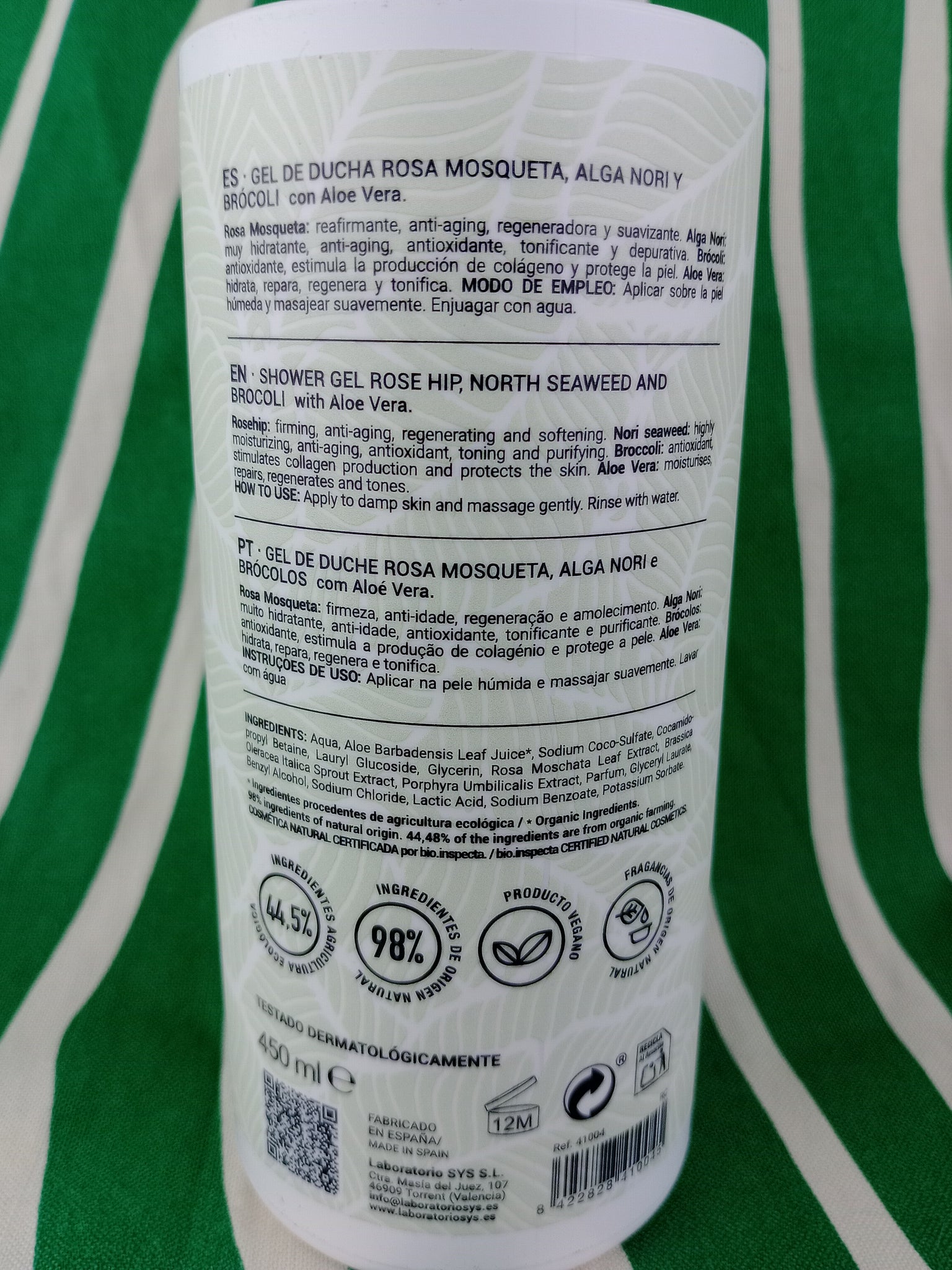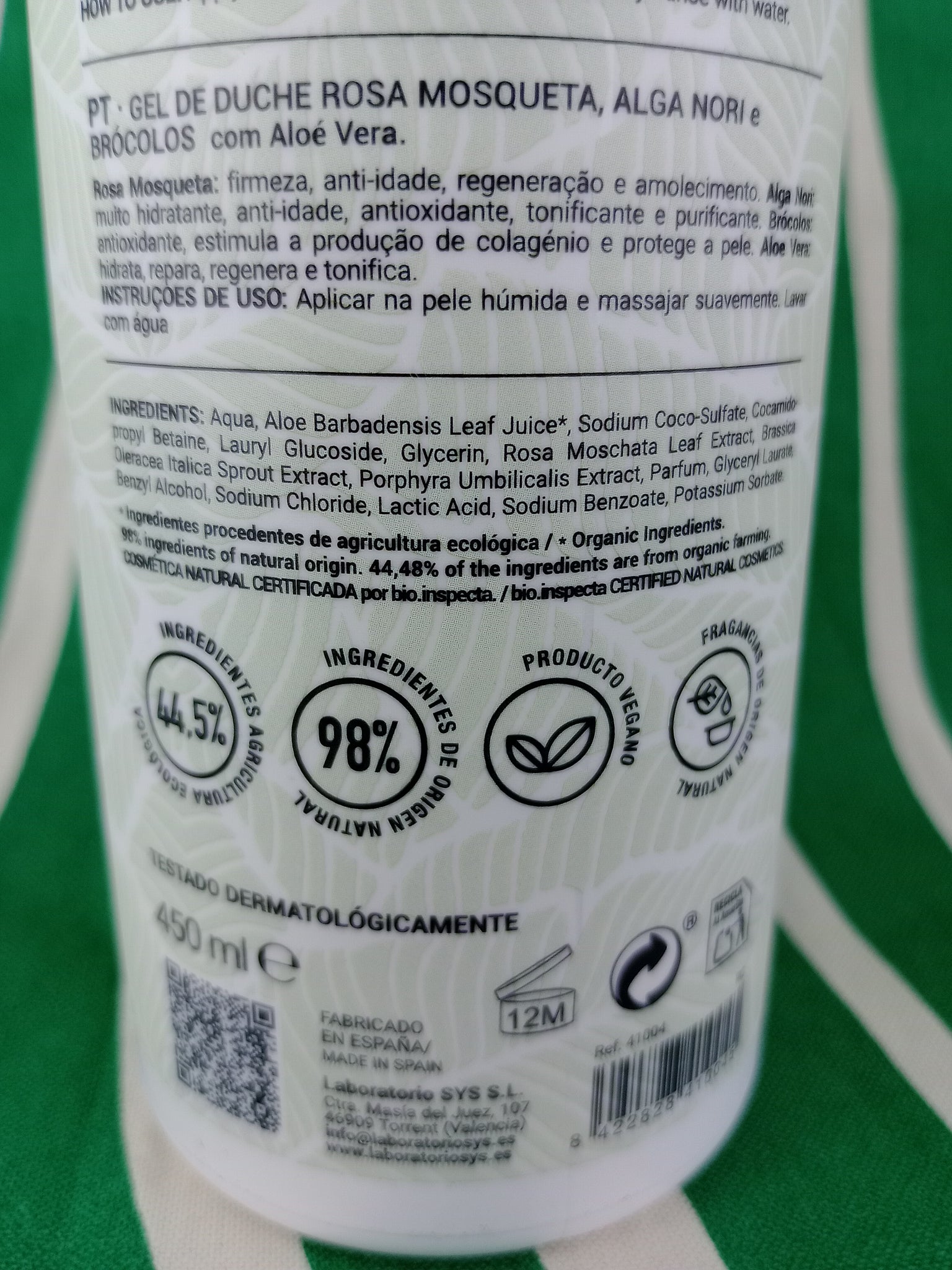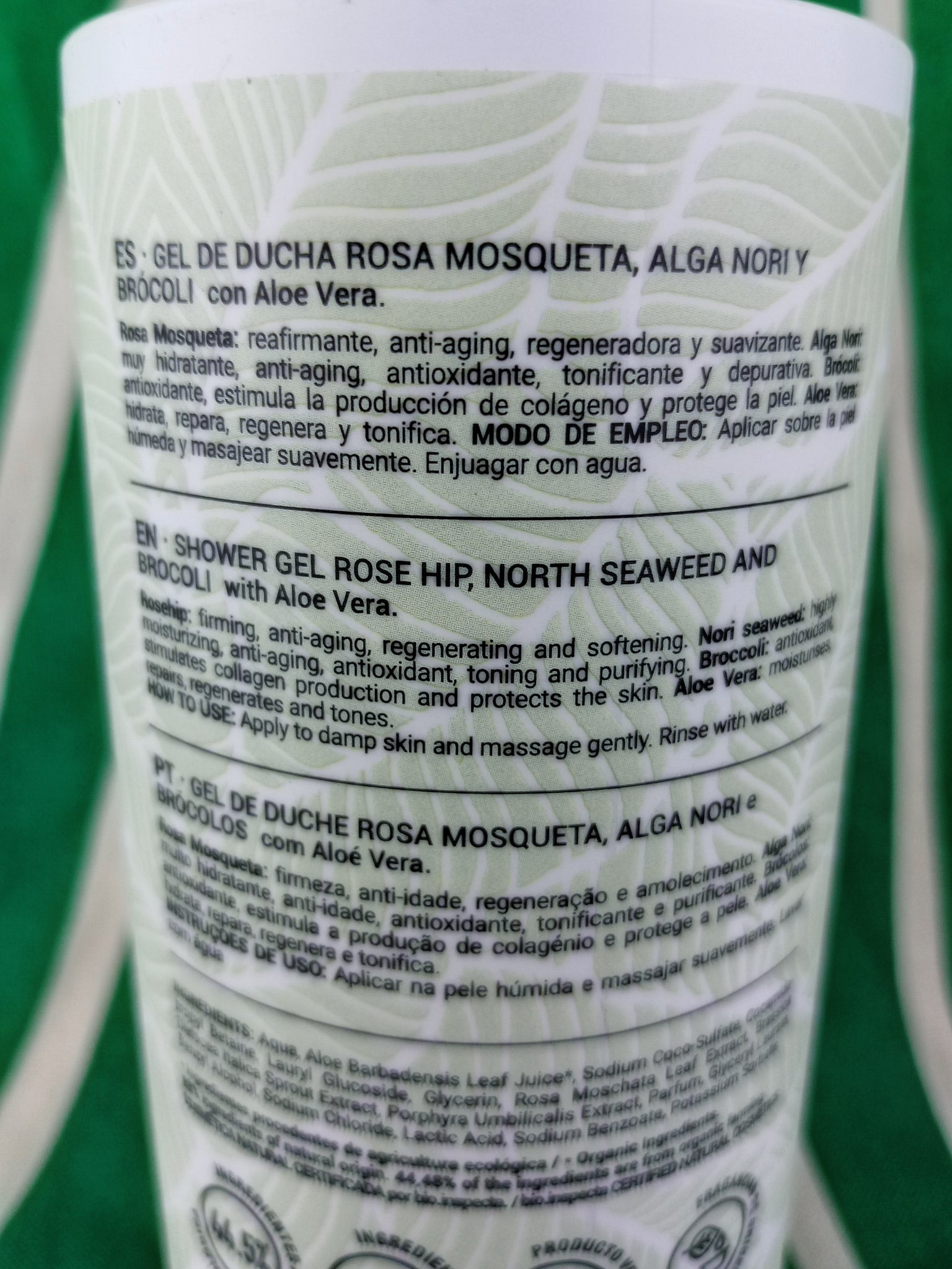 * Ingredientes procedentes de agricultura ecológica. ** Componentes naturales derivados de aceites esenciales. Cosmética Natural certificada por Bio.inspecta. 44,5% del total de los ingredientes proviene de agricultura ecológica. 98% del total es de origen natural. Fragancia Natural.