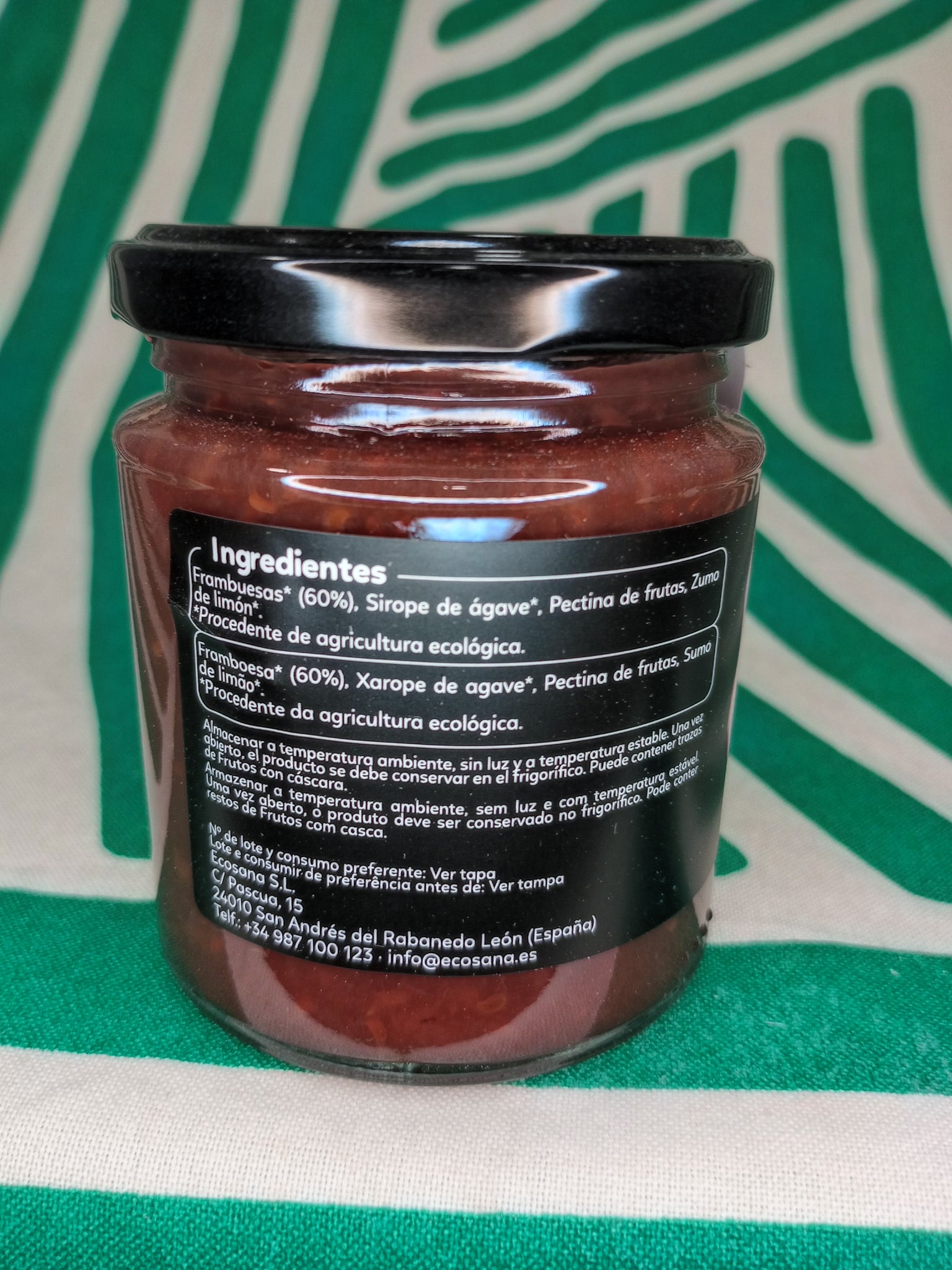 Frambuesas* (60%), Sirope de ágave*, Pectina de frutas, Zumo de limón*. *Procedente de agricultura ecológica