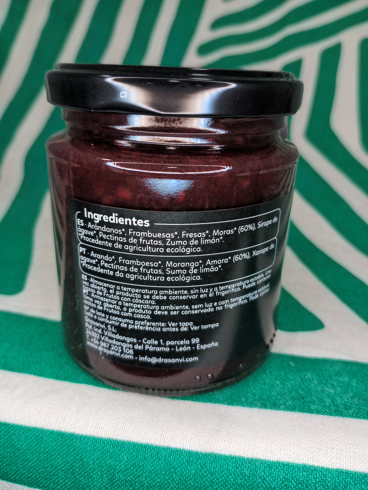 Arandanos*, Frambuesas*, Fresas*, Moras* (60%), Sirope de agave*, Pectina de frutas, Zumo de limón*. *Procedente de agricultura ecológica