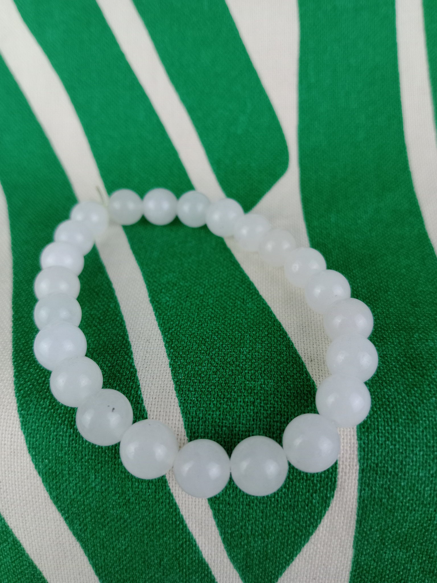 El jade es un mineral venerado en oriente, se considera símbolo de pureza, serenidad y sabiduría. Aporta calma, prosperidad y protección. Su color blanco aporta luz y paz a la persona que lo lleva, el blanco es un color divino
